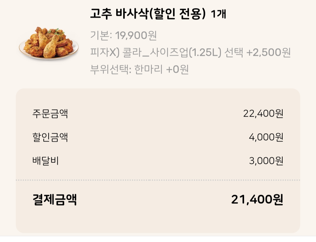 제가 직접 주문한 고추바사삭 + 콜라 1.25L 구성, 배달비 포함해도 21,400원에 해결했어요! (정가 25,400원 기준 → 4천 원 할인)
