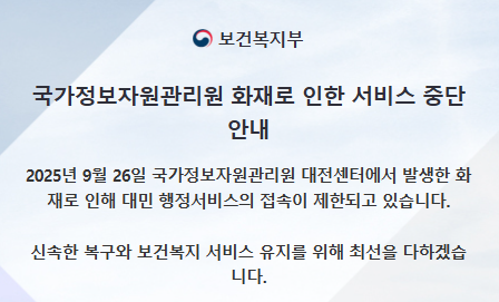 보건복지부는 현재 "신속한 복구와 보건복지 서비스 유지를 위해 최선을 다하겠다"고 밝혔습니다. 정부 전산망의 빠른 정상화를 기다리며, 국민 불편이 최소화될 수 있도록 전화 129나 민원실 방문 등 대체 경로를 확인하여 이용해 주시기 바랍니다.