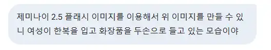 제미나이 2.5 플래시 이미지를 이용해서 위 이미지를 만들 수 있니. 여성이 한복을 입고 화장품을 두 손으로 들고 있는 모습이야.