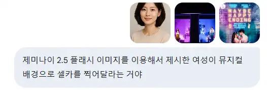 제미나이 2.5 플래시 이미지를 이용해서 제시한 여성이 뮤지컬 배경으로 셀카를 찍어달라는 거야