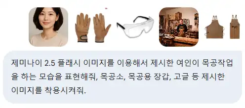 제미나이는 모델에게 목공 작업에 필요한 복장과 장비를 완벽하게 착용시키고, 실제 목공소와 같은 배경 속에서 작업하는 모습을 생생하게 구현해냈습니다.
