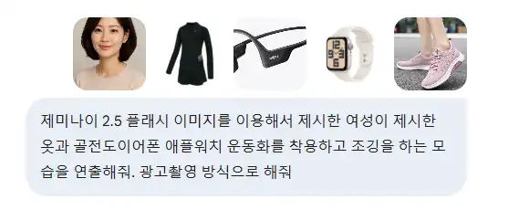 제미나이 2.5 플래시 이미지를 이용해서 제시한 여성이 제시한 옷과 골전도이어폰 애플워치 운동화를 착용하고 조깅을 하는 모습을 연출해줘. 광고촬영 방식으로 해줘