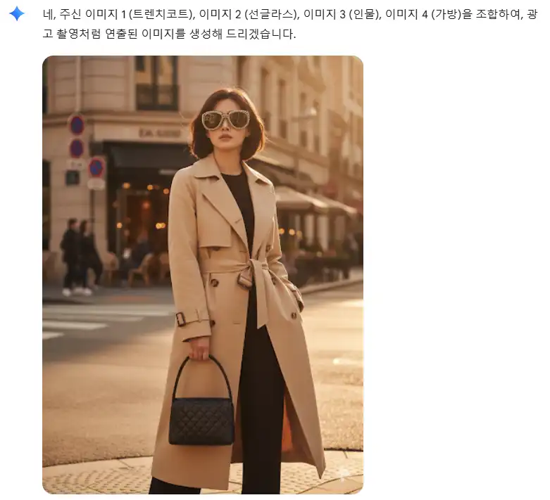 제미나이는 제가 제공한 인물 이미지, 트렌치코트, 선글라스, 가방 이미지를 조합하여 한 편의 패션 화보 같은 결과물을 내놓았습니다.