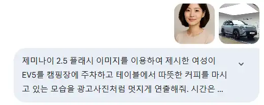 제미나이는 인물, 전기차, 그리고 가을 캠핑이라는 복잡한 요소를 완벽하게 조합하여 한 편의 영화 같은 결과물을 만들어냈습니다.