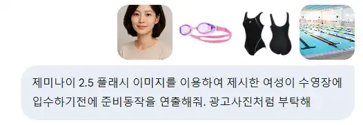 제미나이는 제가 제공한 인물, 수영복, 수경, 그리고 수영장 이미지를 완벽하게 조합하여 생동감 넘치는 광고 사진을 만들어주었습니다.