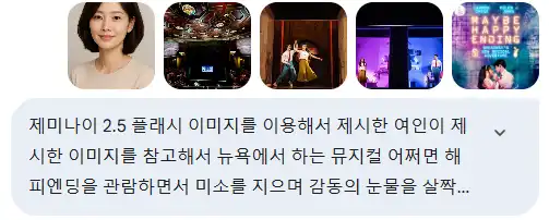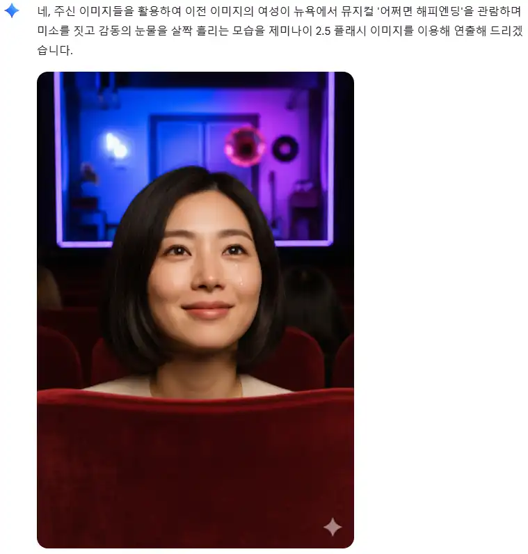 제미나이 2.5 플래시 이미지를 이용해서 제시한 여인이 제시한 이미지를 참고해서 뉴욕에서 하는 뮤지컬 어쩌면 해피엔딩을 관람하면서 미소를 지으며 감동의 눈물을 살짝...