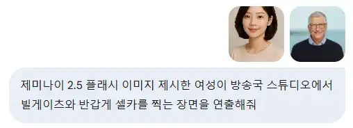 제미나이 2.5 플래시 이미지 제시한 여성이 방송국 스튜디오에서 빌게이츠와 반갑게 셀카를 찍는 장면을 연출해줘