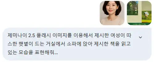 제미나이 2.5 플래시 이미지를 이용해서 제시한 여성이 따스한 햇볕이 드는 거실에서 소파에 앉아 제시한 책을 읽고 있는 모습을 표현해줘. 책 표지가 잘 보이도록 클로즈업하여 보여드리겠습니다.