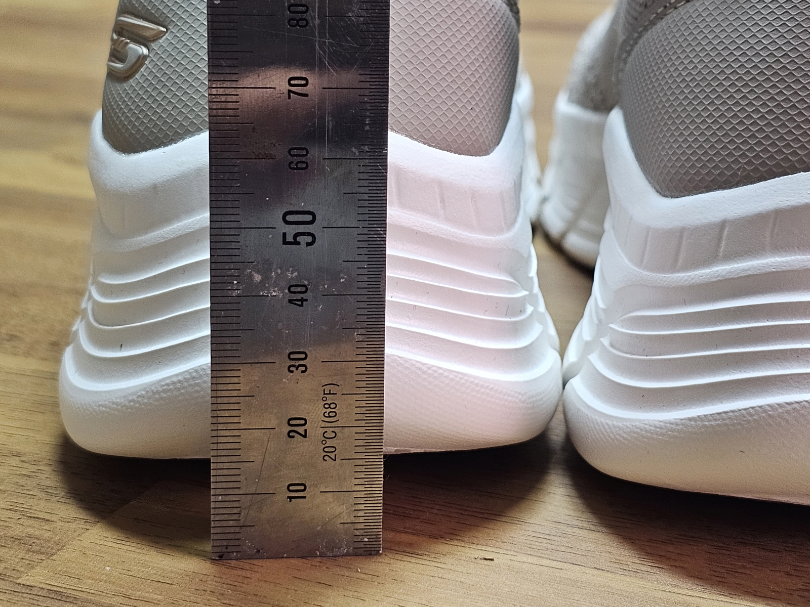 블로그 리뷰를 위해 남편이 꼼꼼하게 줄자와 주방 저울을 가져와서 실제 스펙을 측정해 주었습니다. 겉보기에는 평범한 슬립온 같지만, 바닥면부터 뒤축까지의 굽 높이가 무려 4.5cm에서 5cm에 달합니다. 넉넉한 쿠셔닝은 기본이고, 신었을 때 자연스럽게 다리가 길어 보이는 키높이 효과까지 얻을 수 있습니다.