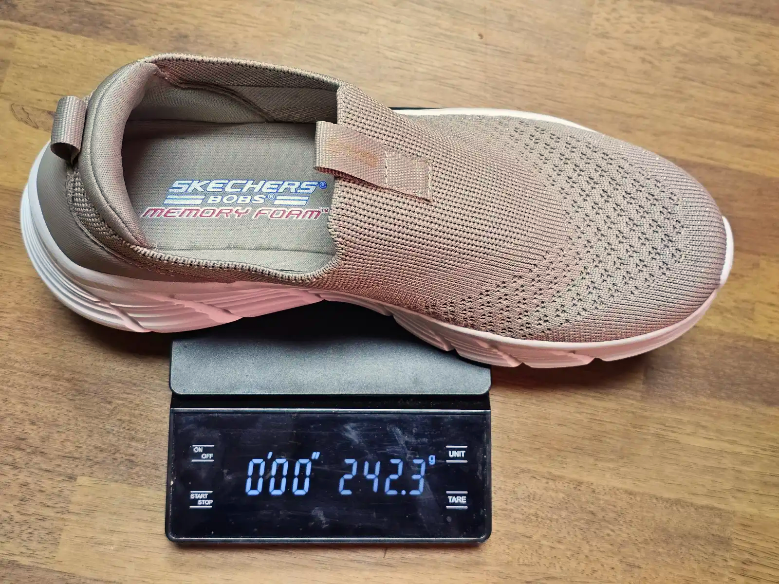 이 정도로 밑창이 두꺼우면 신발이 묵직하지 않을까 걱정했지만, 한쪽 무게를 재어보니 단 242.3g에 불과했습니다. 스마트폰 한 대 정도의 무게밖에 되지 않는 초경량 워킹화라 오래 걸어도 발목 관절에 전혀 부담이 가지 않습니다.