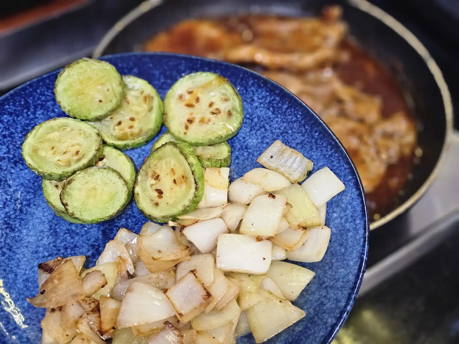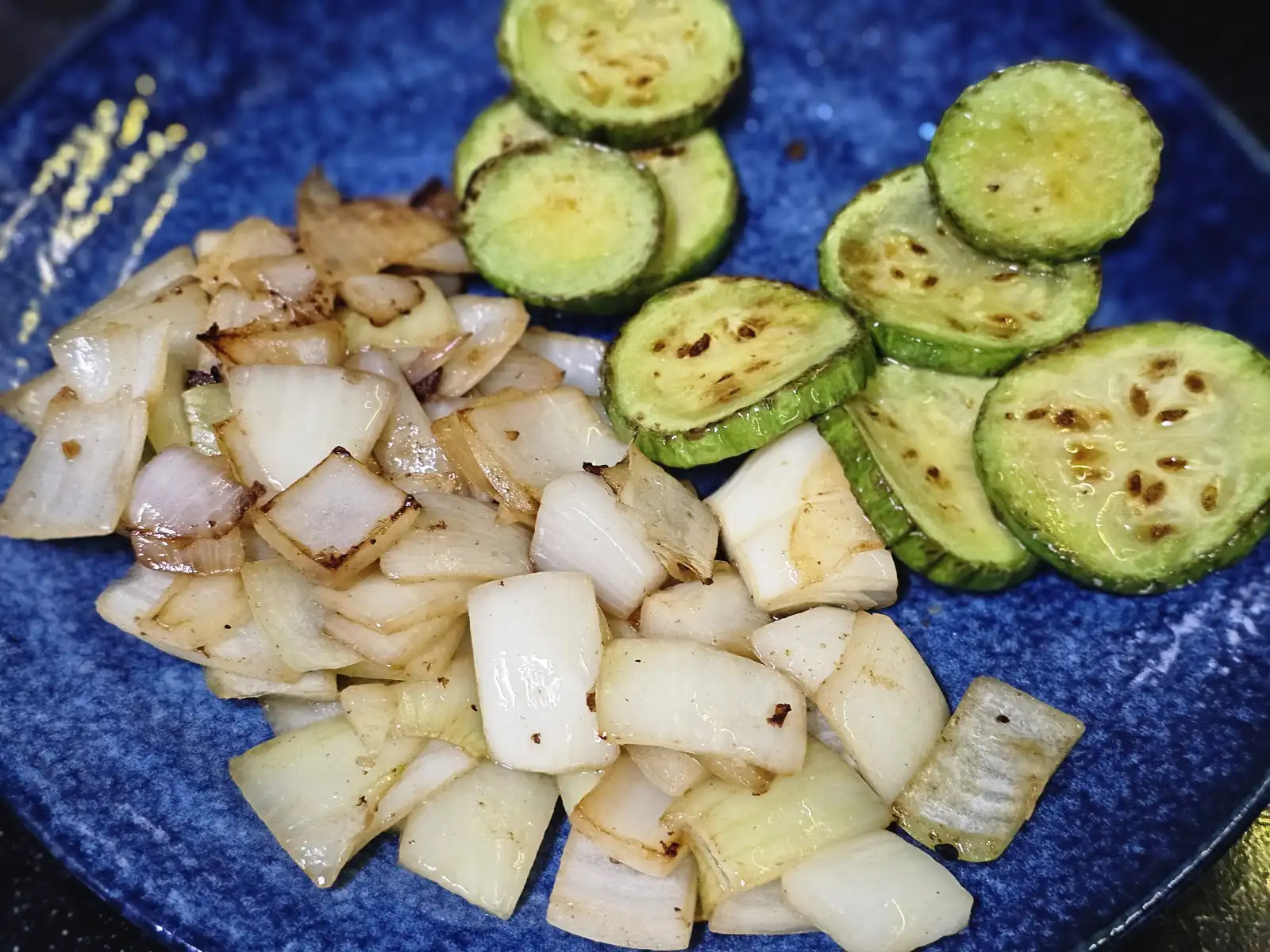 달군 팬에 기름을 두르고 양파, 애호박, 마늘을 노릇하게 구워 접시에 따로 빼주세요.