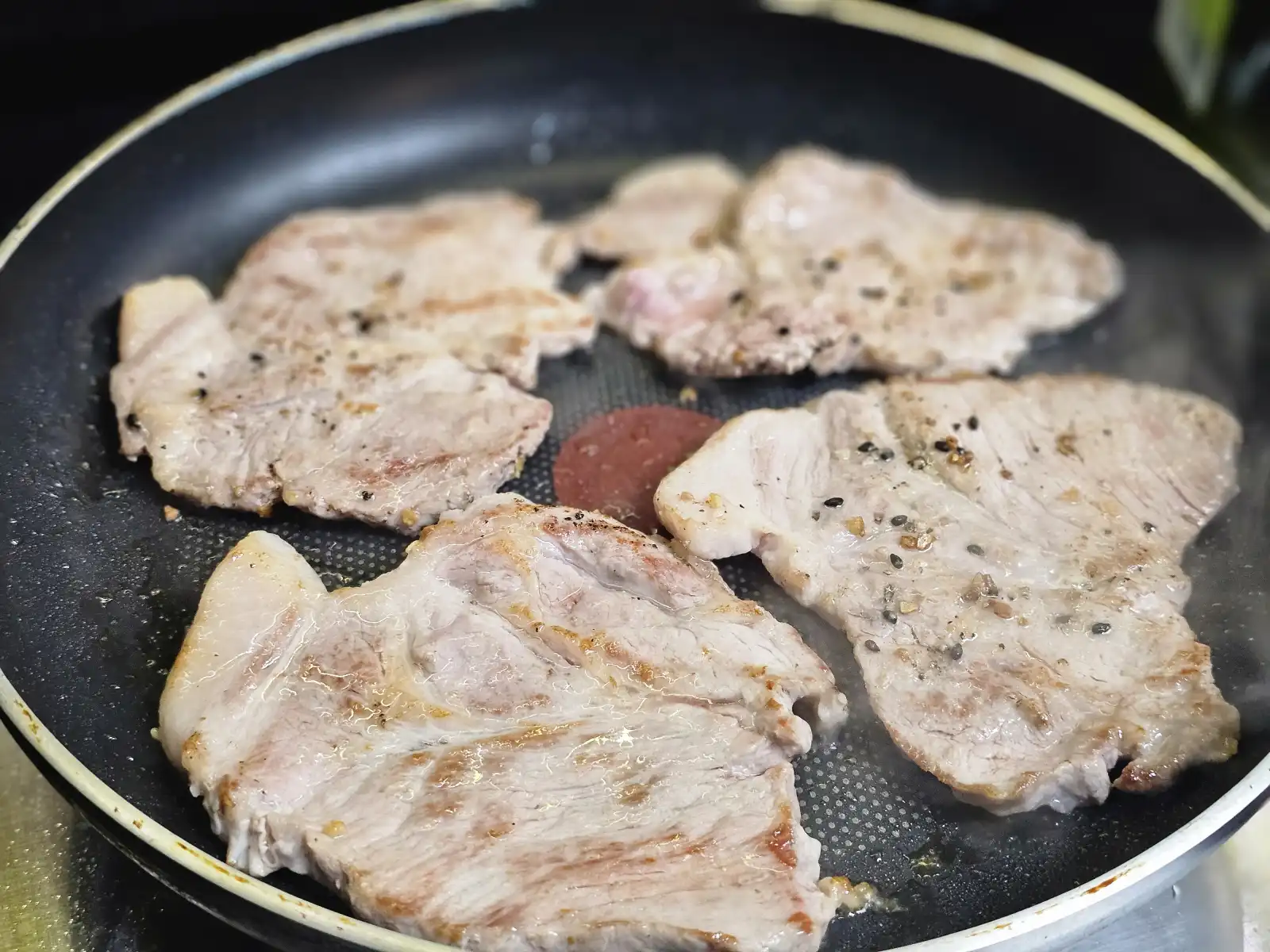 센 불에서 목살을 앞뒤로 굽습니다. "좀 탔나?" 싶을 정도로 갈색이 돌게 바짝 구워주세요. 이것을 '시어링'이라고 하는데, 육즙을 가두는 과정이에요.