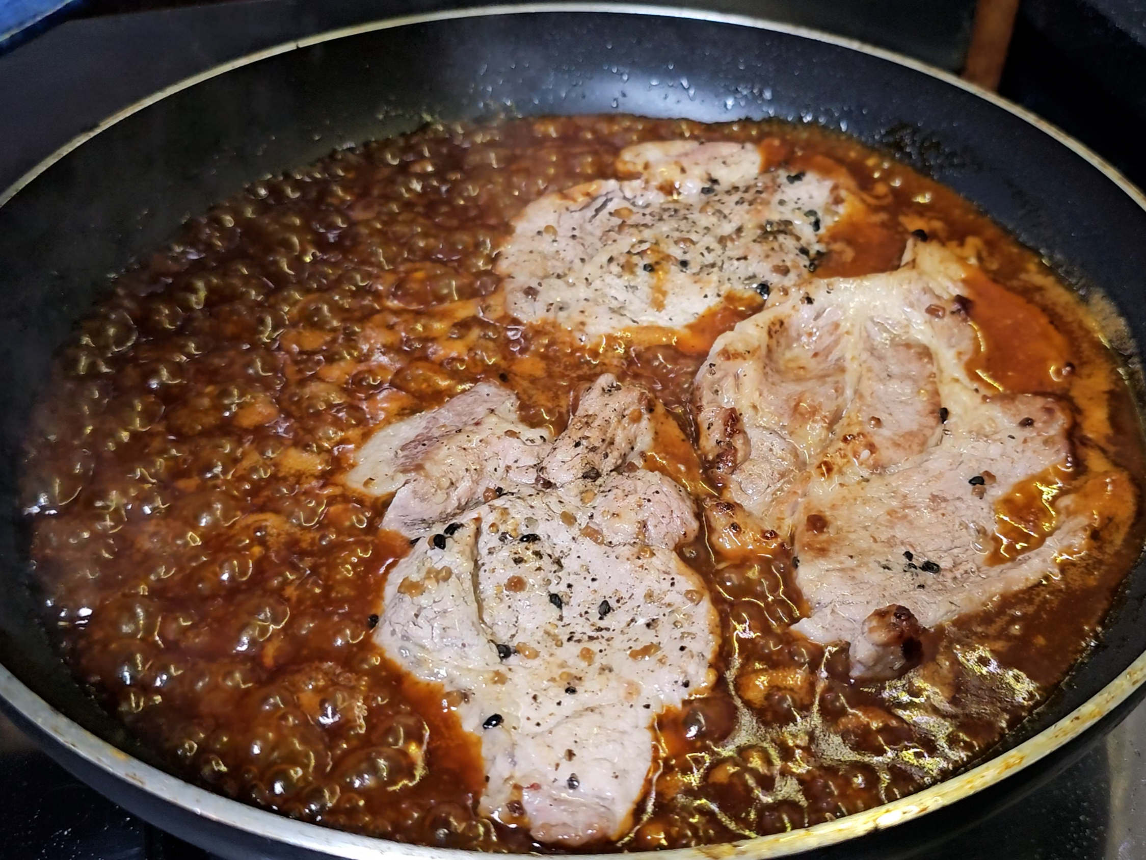 고기 구운 팬을 키친타월로 닦아낸 뒤(탄 것 제거), 만들어둔 소스와 버터 3조각을 넣고 중불을 켭니다. 버터가 녹아 소스와 섞이면 풍미가 폭발합니다.