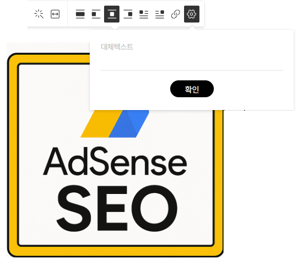 방법1: 이미지에 마우스 커서를 올려 클릭하면 상단에 기어무늬의 설정창을 누릅니다. 대체텍스트 박스에 설명을 넣어주면 alt속성이 넣어집니다.