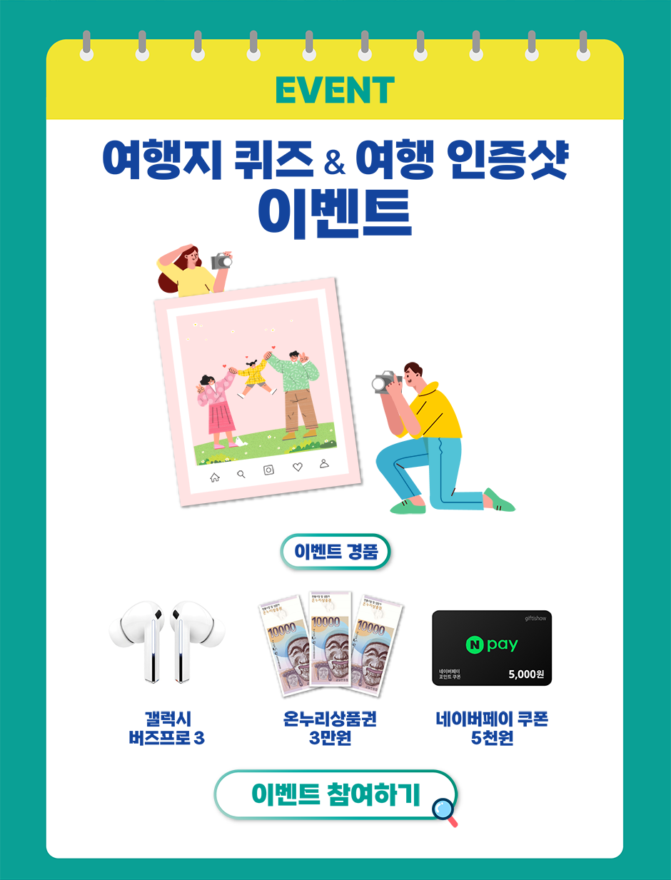 - 방문 인증 이벤트 (6월 20일까지): 추천 여행지를 방문하거나 관련 퀴즈에 참여하시면 추첨을 통해 갤럭시 버즈 프로3, 온누리상품권 같은 선물도 받을 수 있다고 해요.