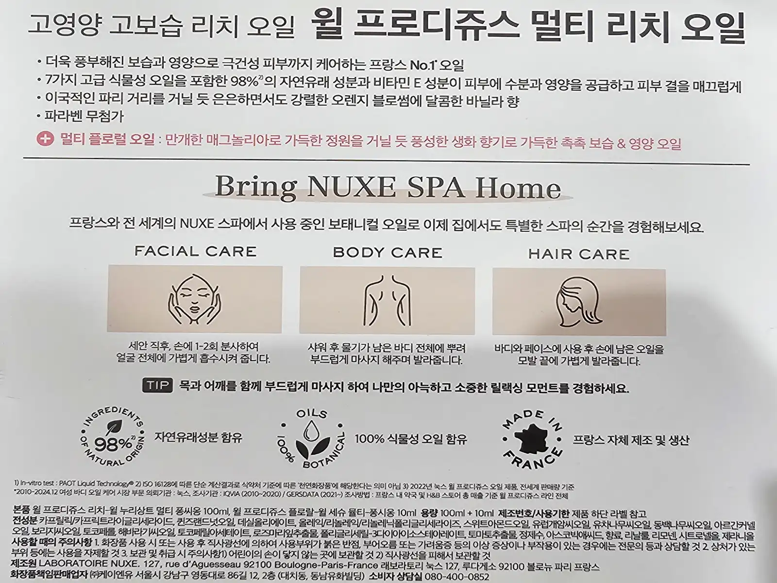저는 화장품을 고를 때 '향'을 정말 중요하게 생각하는데요. 눅스 오일은 뚜껑을 열자마자 퍼지는 그 특유의 고급스러운 향이 너무 좋아요.