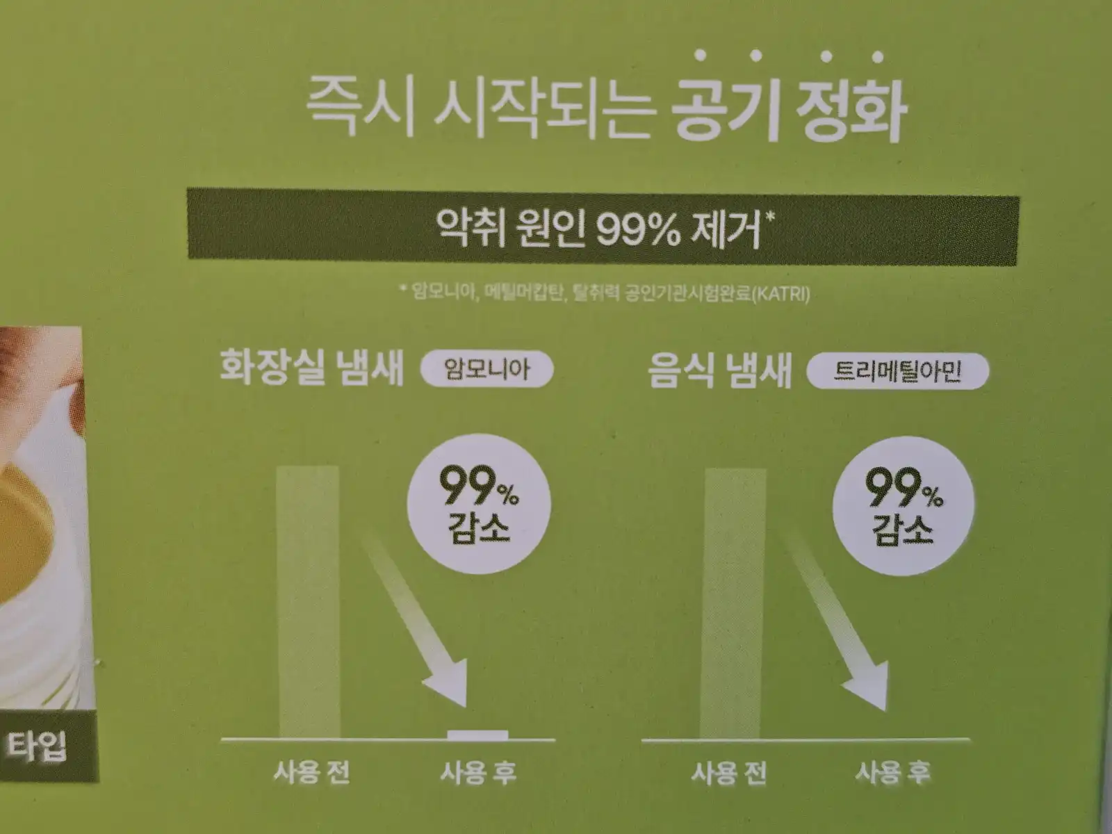 제품 패키지에 기재된 시험 성적서에 따르면, 생활 악취의 주요 원인인 암모니아(화장실 냄새), 트리메틸아민(부패한 음식 냄새)을 99% 제거하는 것으로 표기되어 있습니다. 이는 물리적인 환기가 어려운 공간에서 유의미한 기능을 할 것으로 판단됩니다.