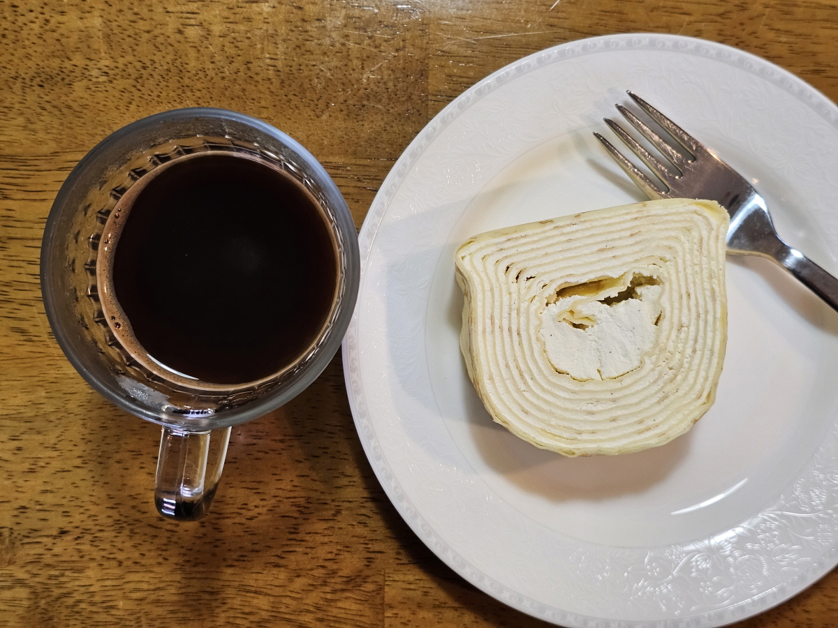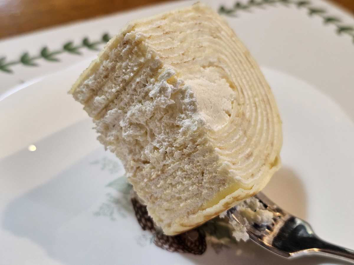 얇은 크레이프를 겹겹이 돌돌 말아 만든 롤케이크 느낌이에요.