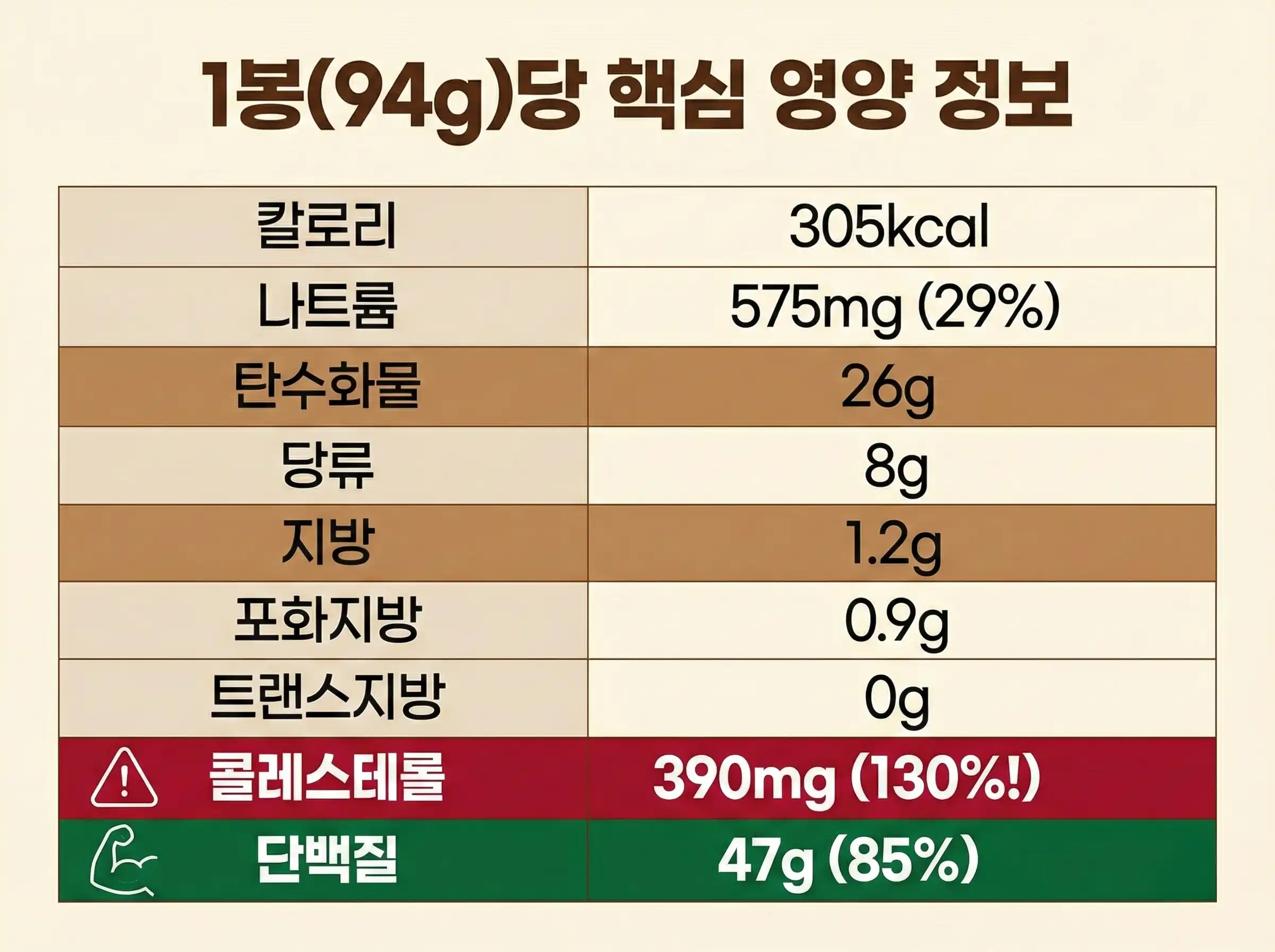 하지만 빛이 있으면 그림자도 있는 법... 빨간색 경고등이 켜진 부분도 꼭 확인하셔야 해요. 😱 바로 콜레스테롤 390mg (130%)과 나트륨 575mg (29%)입니다. 한 봉지를 다 먹으면 성인 하루 권장 콜레스테롤 섭취량을 훌쩍 넘기게 돼요. 평소 고지혈증이나 혈압 관리에 신경 쓰시는 분들은 절대 한 번에 다 드시지 마시고, 꼭 가족이랑 나눠 드시거나 하루에 반 봉지 정도로 양을 조절해서 드시는 게 건강을 위해 좋을 것 같아요.