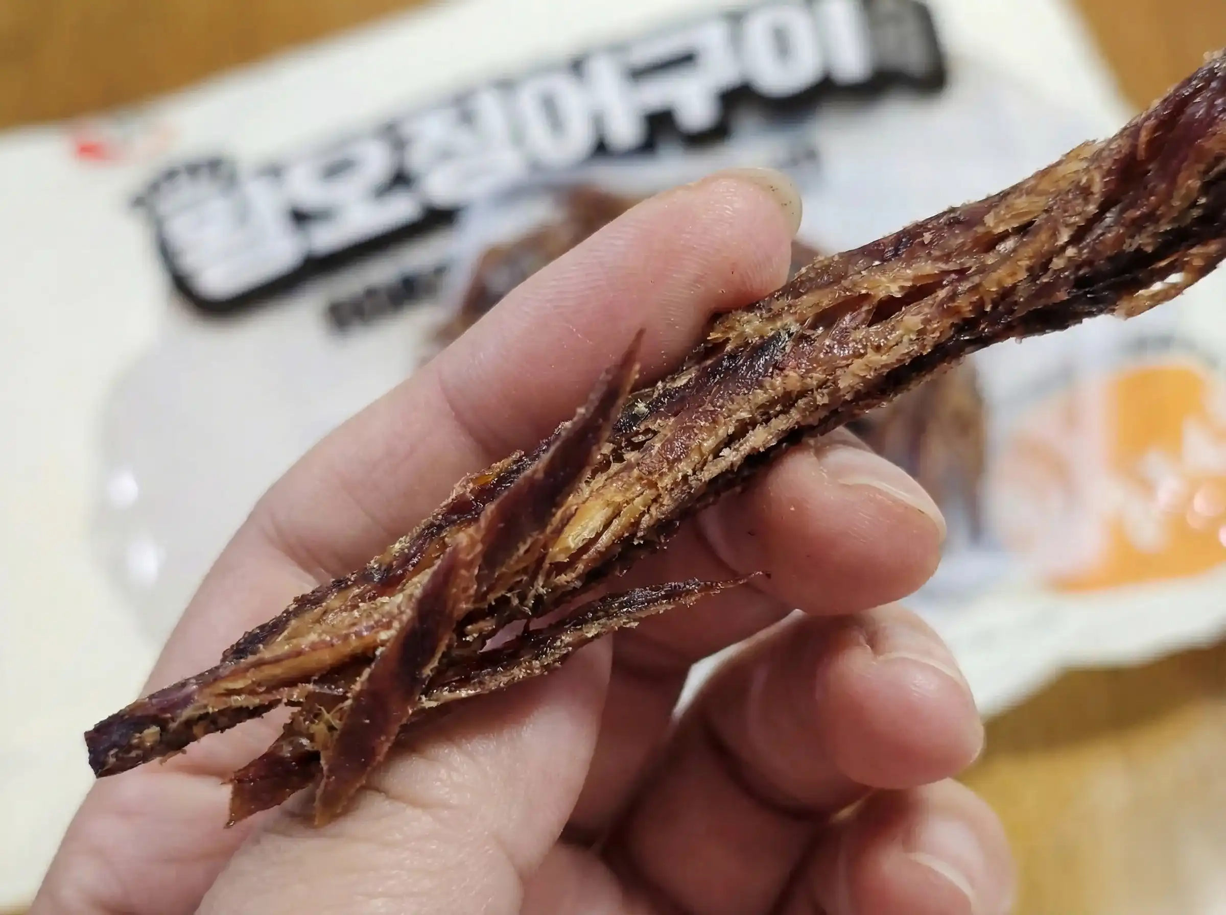 봉지를 뜯자마자 영화관에서 맡던 그 훈제의 향이 확 풍기는데, 침이 꼴깍 넘어가더라고요. 일반 마른 오징어처럼 딱딱하지 않지만 그래도 딱딱한 식감입니다. 저는 오히려 말린 문어 맛도 느낌이 나서 좋았어요