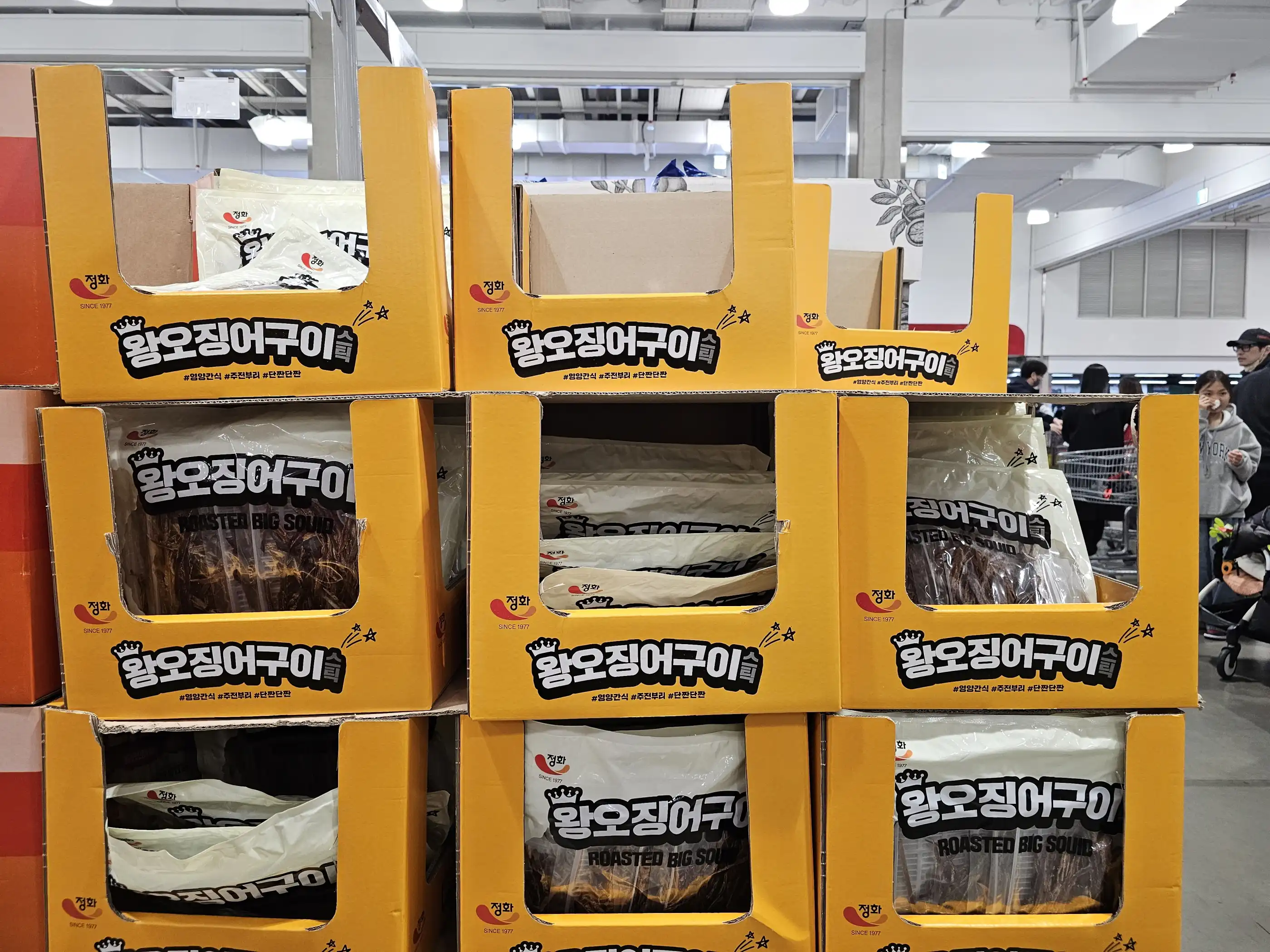카트를 끌고 식품 코너를 돌던 중, 시식 코너 앞에서 사람들이 웅성웅성 모여있는 걸 발견했어요. 고소한 버터 냄새에 이끌려 가보니, 맥주 애호가들 사이에서 이미 유명한 '정화 왕오징어구이 스틱'을 굽고 계시더라고요!
