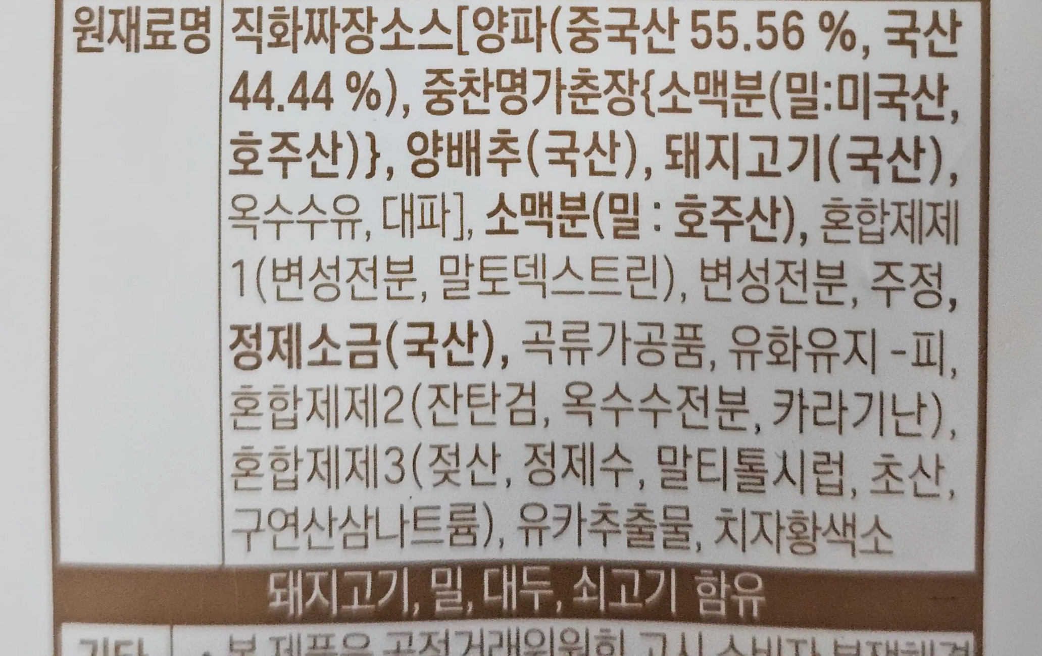 자세한 원재료명도 살펴보니, 짜장 소스에는 양파, 양배추, 돼지고기가 들어갔다고 해요. 양파는 중국산 55.56%, 국내산 44.44%가 사용되었고, 돼지고기 역시 국내산이라고 적혀있었어요. 안심하고 먹을 수 있는 재료들이라 좋았습니다.