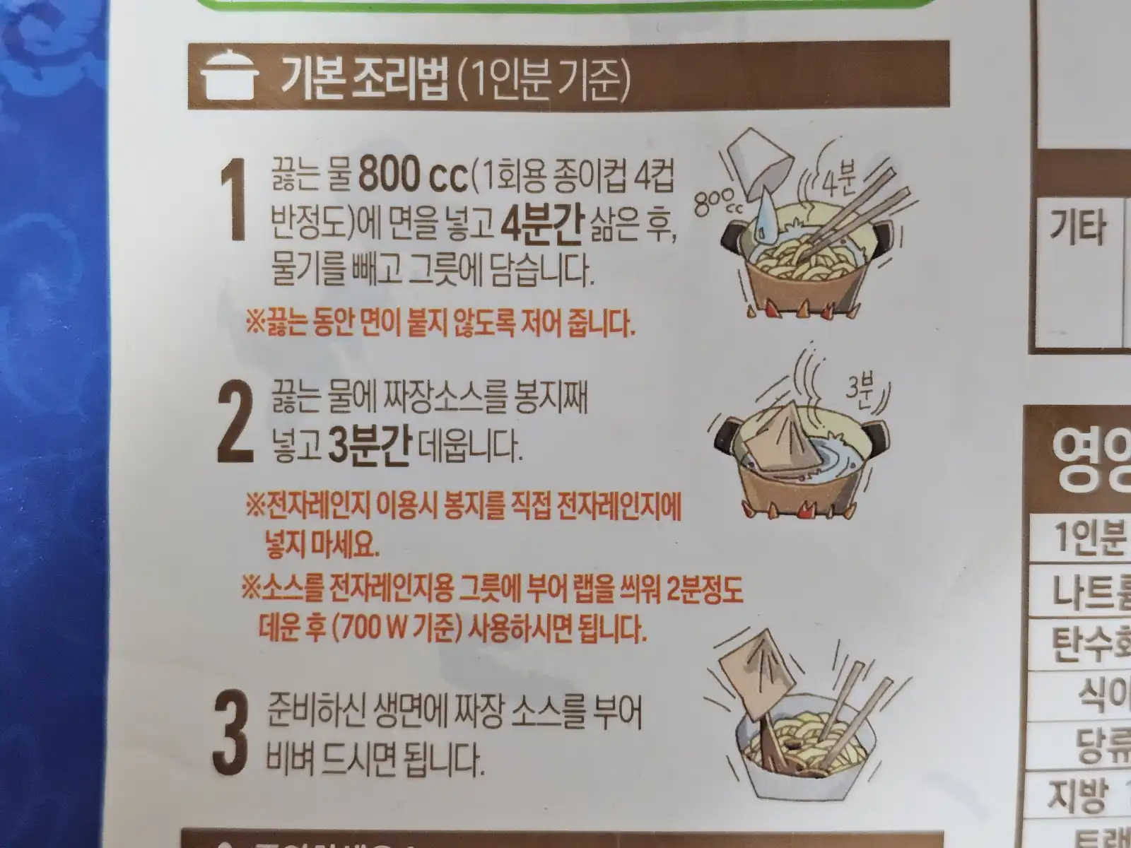 - 소스를 데우기: 면이 익는 동안, 다른 냄비에 끓는 물을 준비해서 짜장 소스 봉투를 통째로 넣고 3분간 데워줘요. 전자레인지에 데울 경우, 소스를 용기에 덜어 랩을 씌운 뒤 2분 정도 돌리면 돼요.