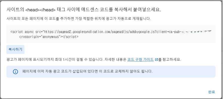 3. <head> 태그 내부에 광고 코드 삽입