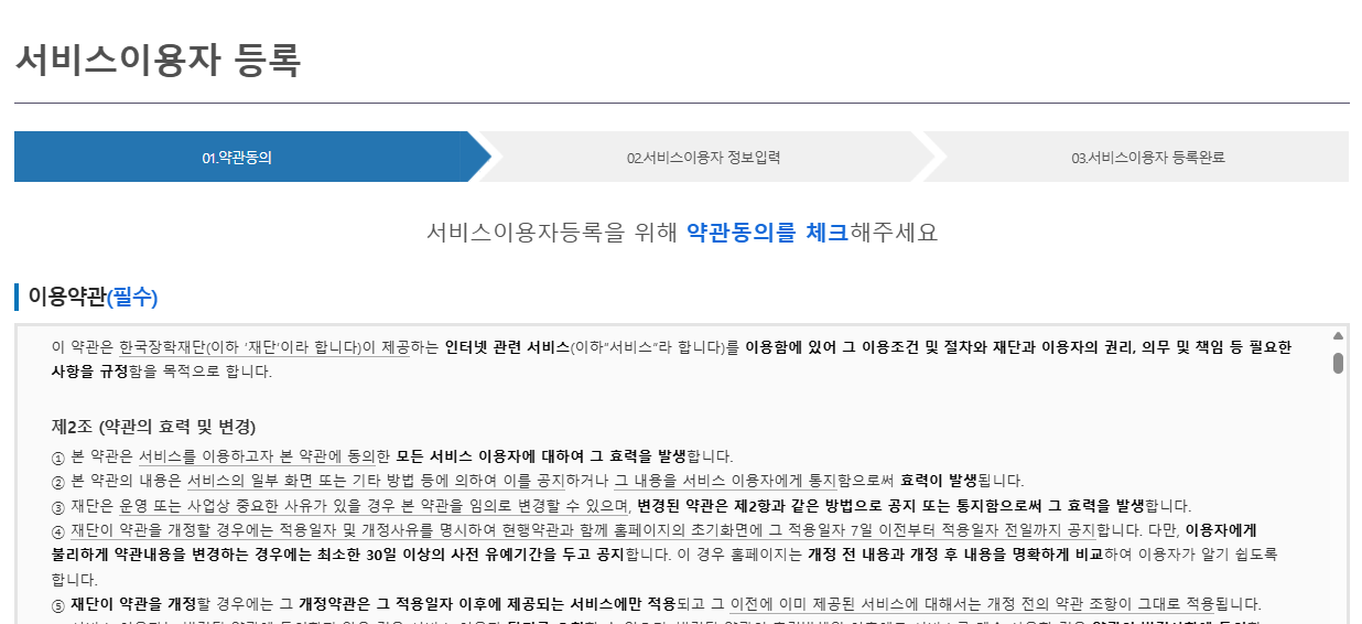 - 서비스 이용자 등록 페이지 접속: 한국장학재단 웹사이트에서 [서비스 이용자 등록] 페이지로 이동합니다.