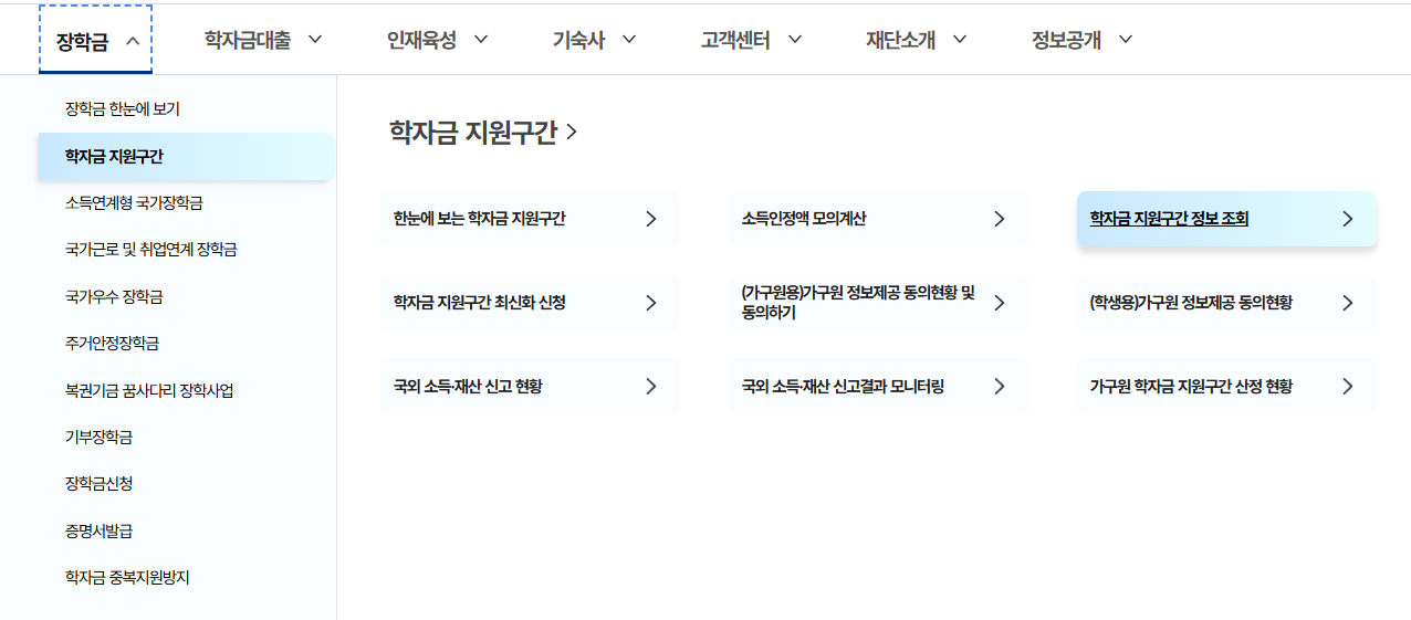 - 메뉴 이동: 상단 메뉴 중 '장학금'을 선택하고, 하위 메뉴에서 '학자금 지원구간'을 클릭합니다.