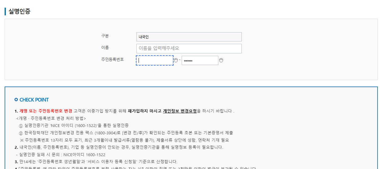 - 실명인증: 이름, 주민등록번호를 입력하고 공동인증서, 금융인증서, 간편인증 등을 통해 본인 명의로 실명인증을 완료합니다.