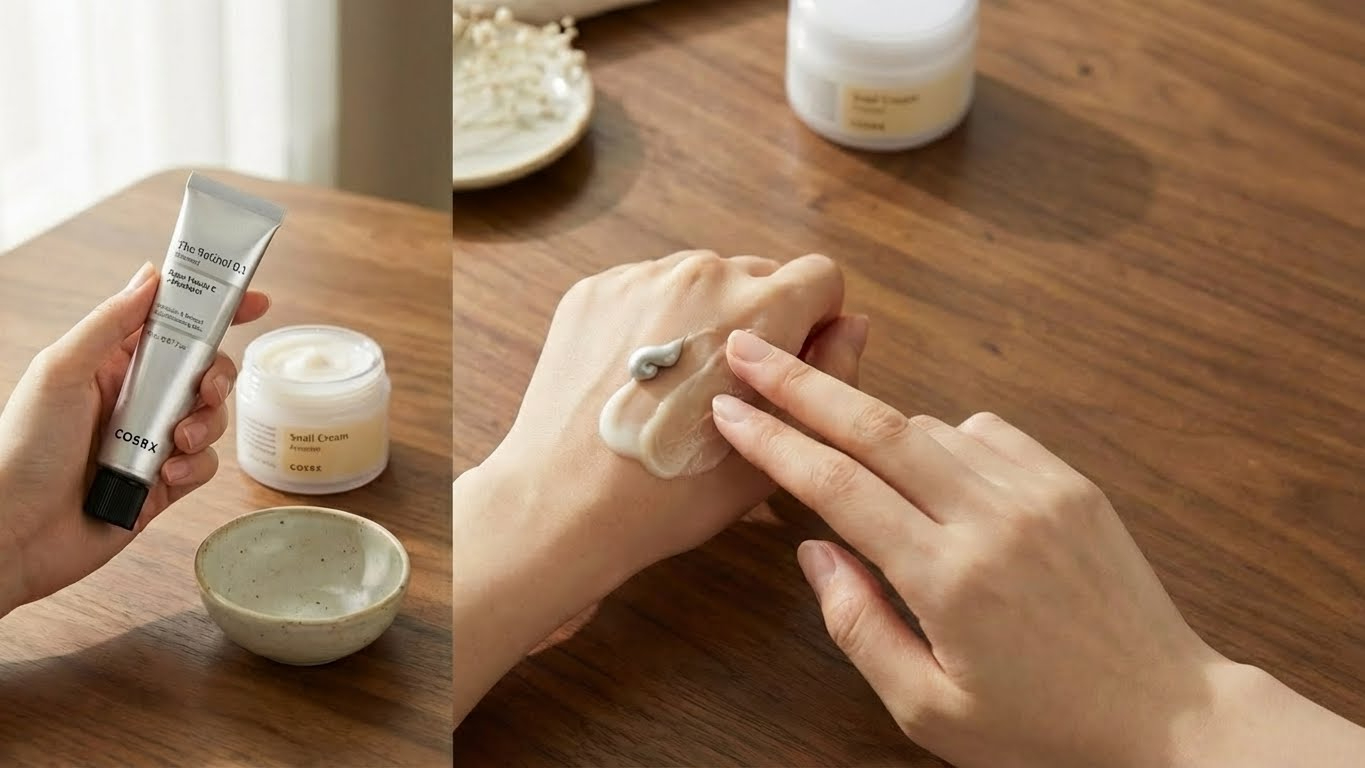 | 🧴 준비물: 평소 쓰는 수분크림 또는 로션 💧 비율: 수분크림(듬뿍) : 레티놀(쌀알만큼) 손바닥이나 손등에서 잘 섞은 다음 얼굴 전체에 펴 발라주세요. 이렇게 하니까 발림성도 부드럽고, 피부가 따갑거나 건조한 느낌이 전혀 없었어요. |