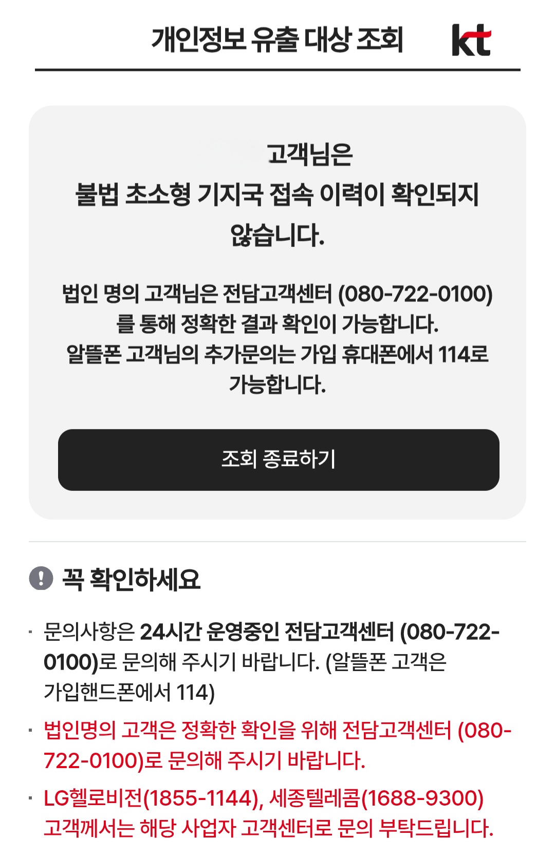 - KT 고객센터 신고: 소액결제 피해 내역을 확인했다면 즉시 KT 고객센터(국번없이 100번 또는 114번)에 전화해 소액결제 차단을 요청하고 피해 결제 내역에 대한 이의 신청을 하세요.